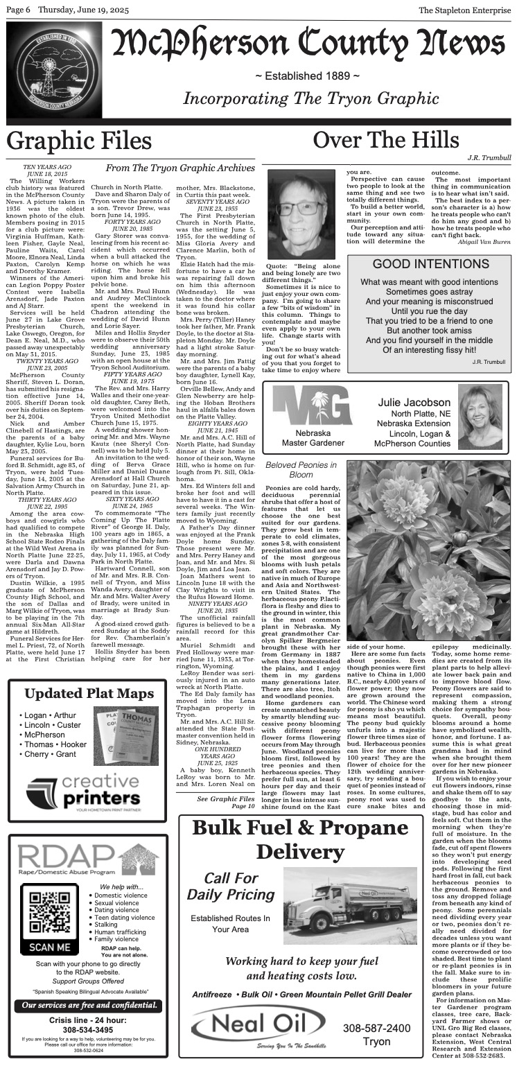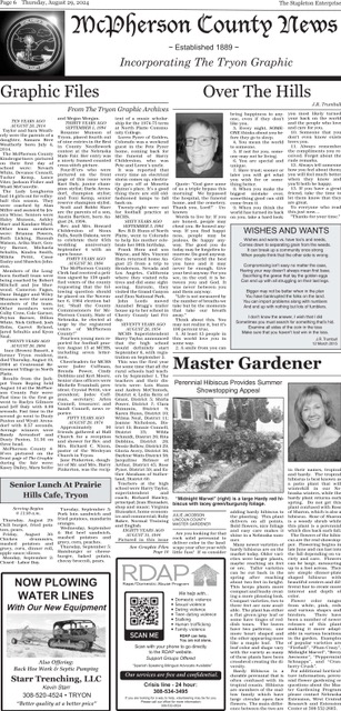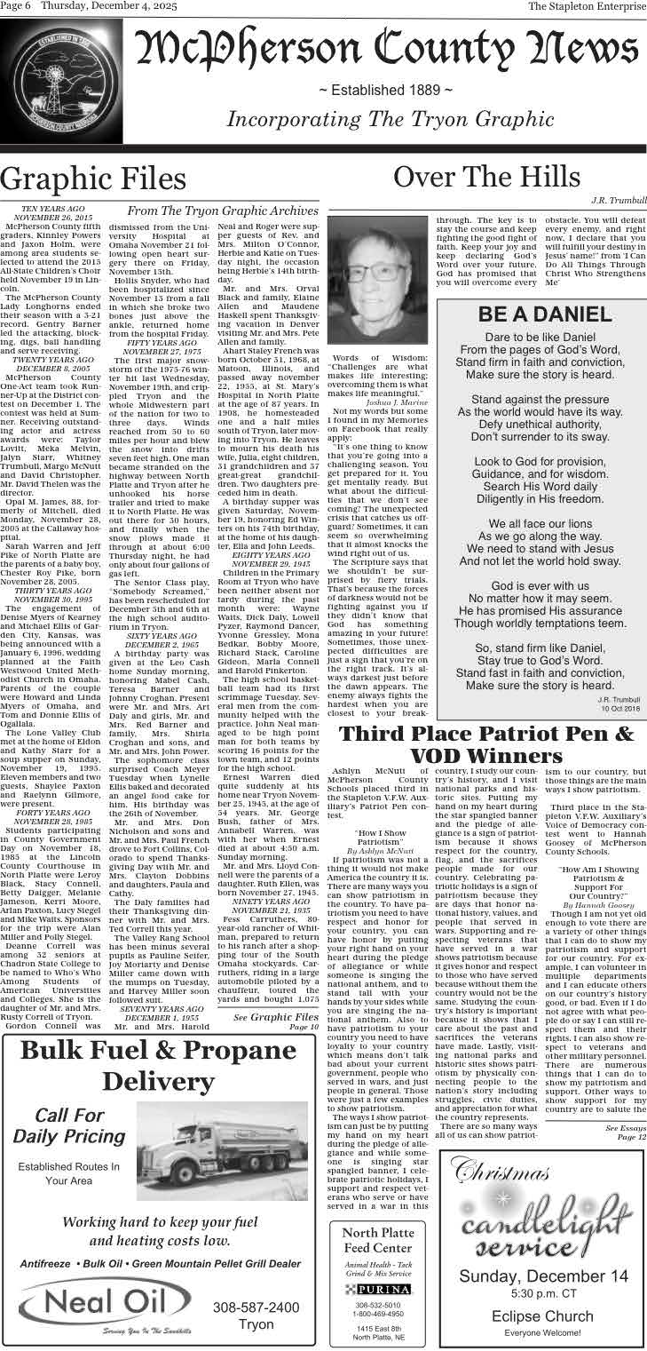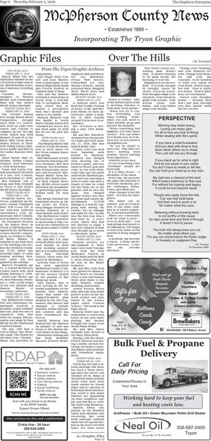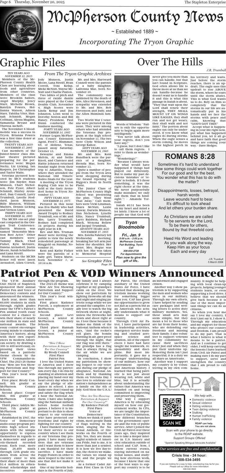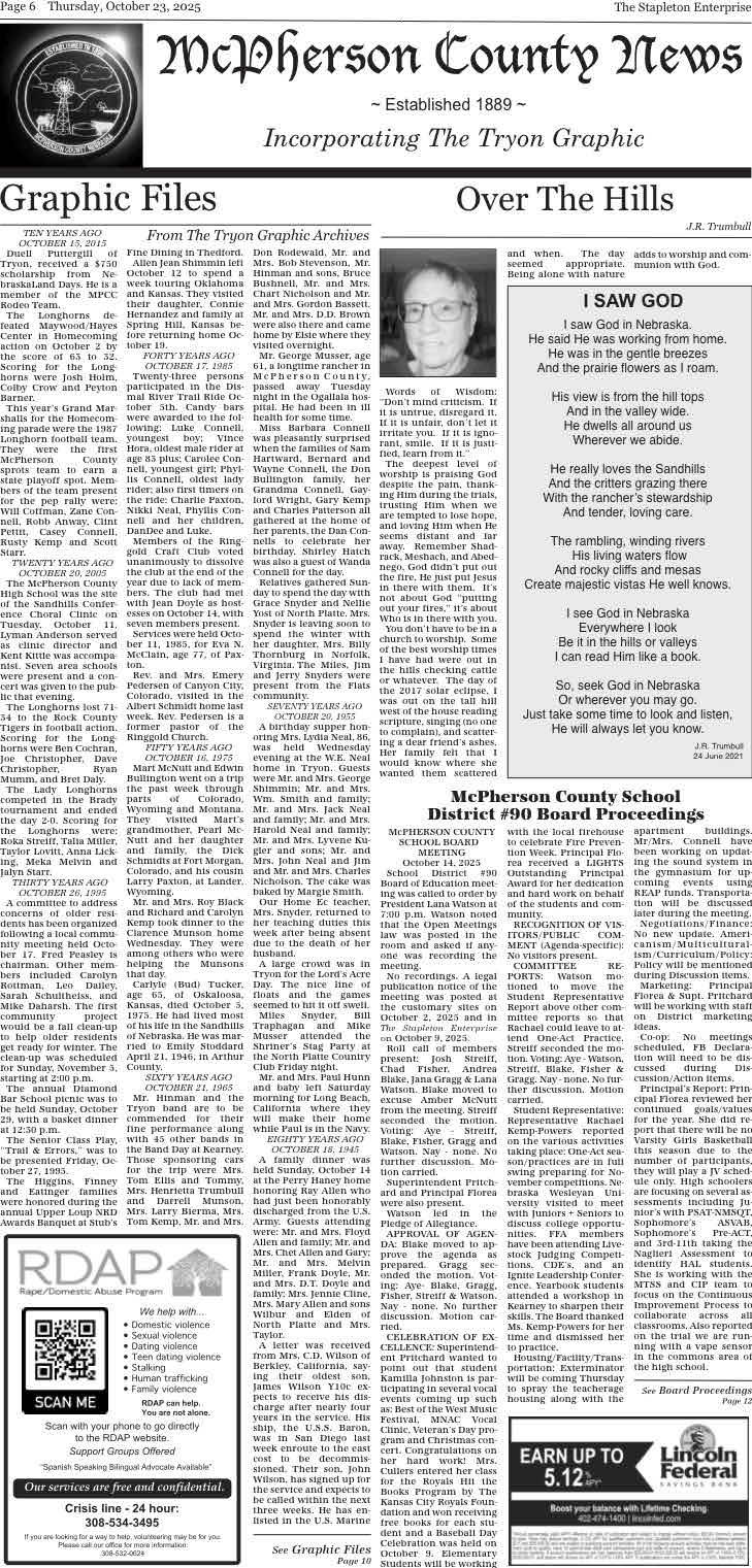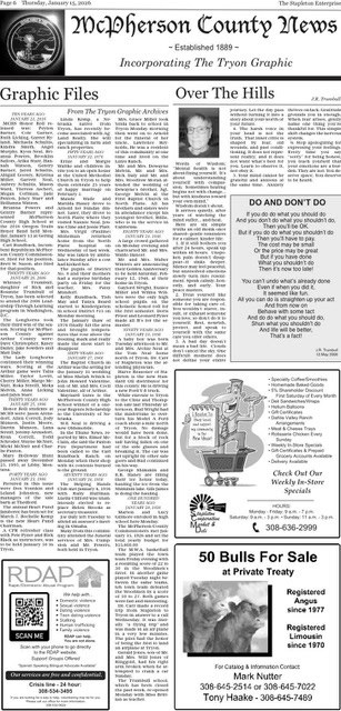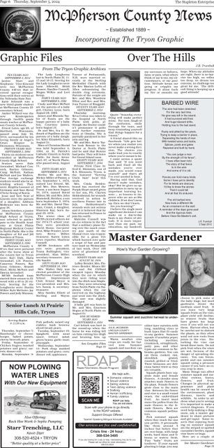 The McPherson County News was established in 1889. The Tryon Graphic and The Stapleton Enterprise merged into one newspaper in 2009. The McPherson County News continues to bring weekly news coverage of “the county.”