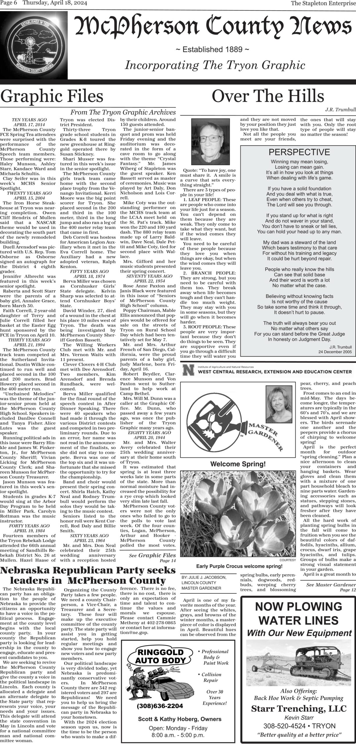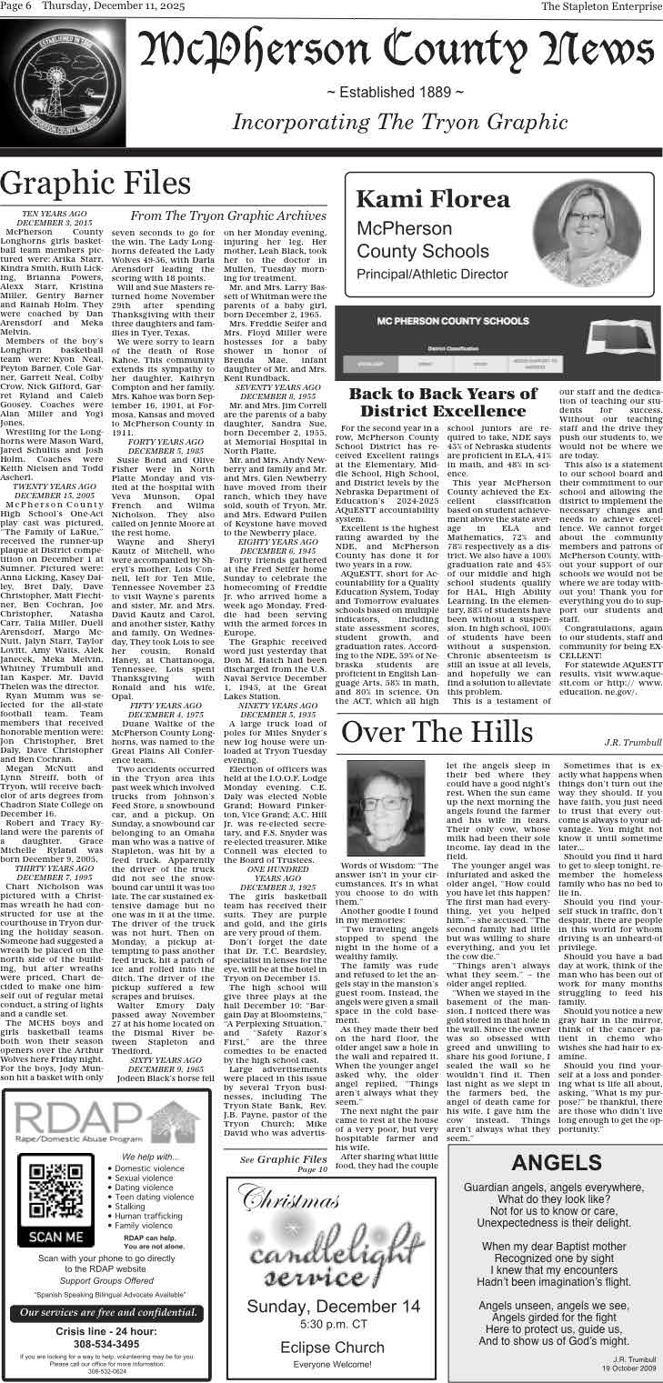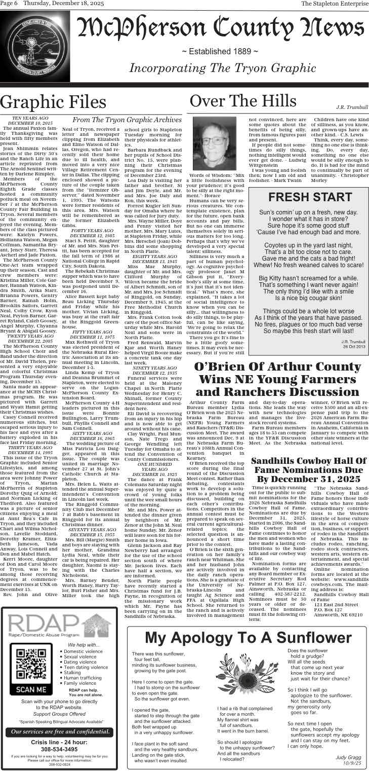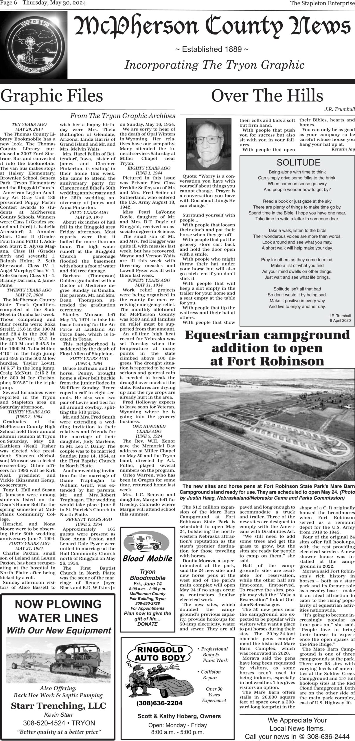 The McPherson County News was established in 1889. The Tryon Graphic and The Stapleton Enterprise merged into one newspaper in 2009. The McPherson County News continues to bring weekly news coverage of “the county.”