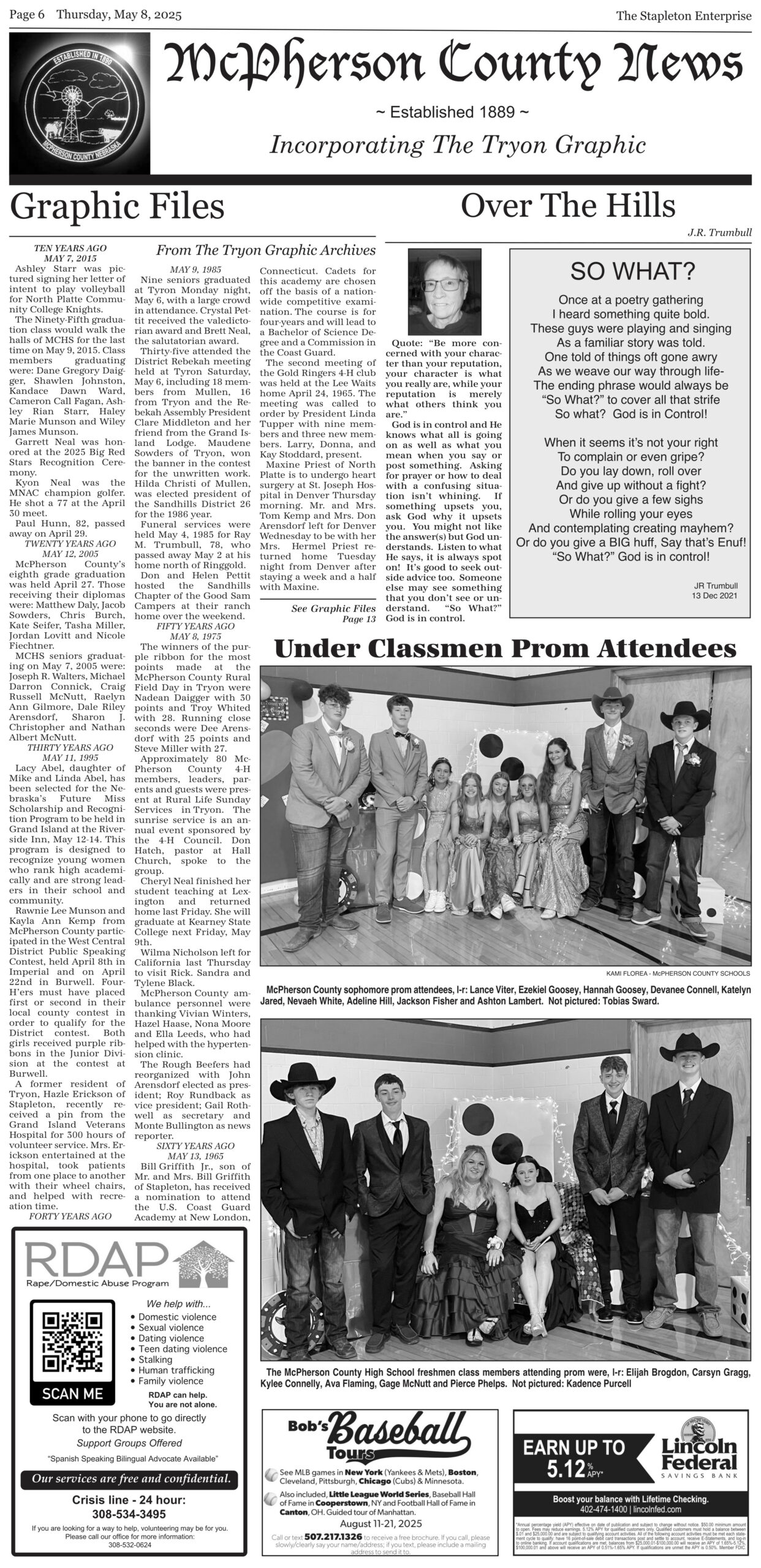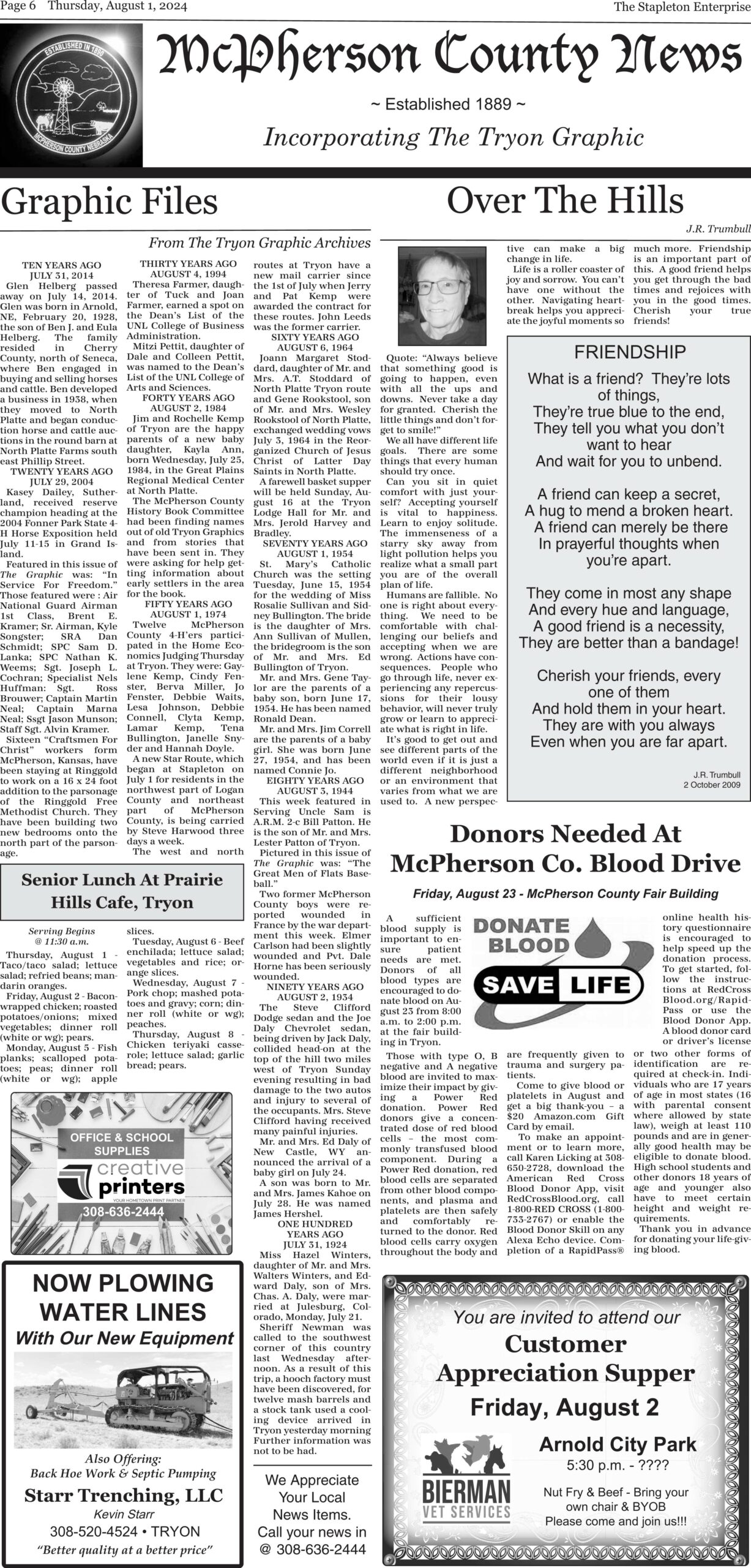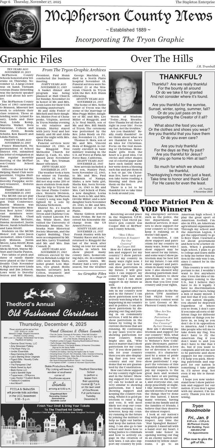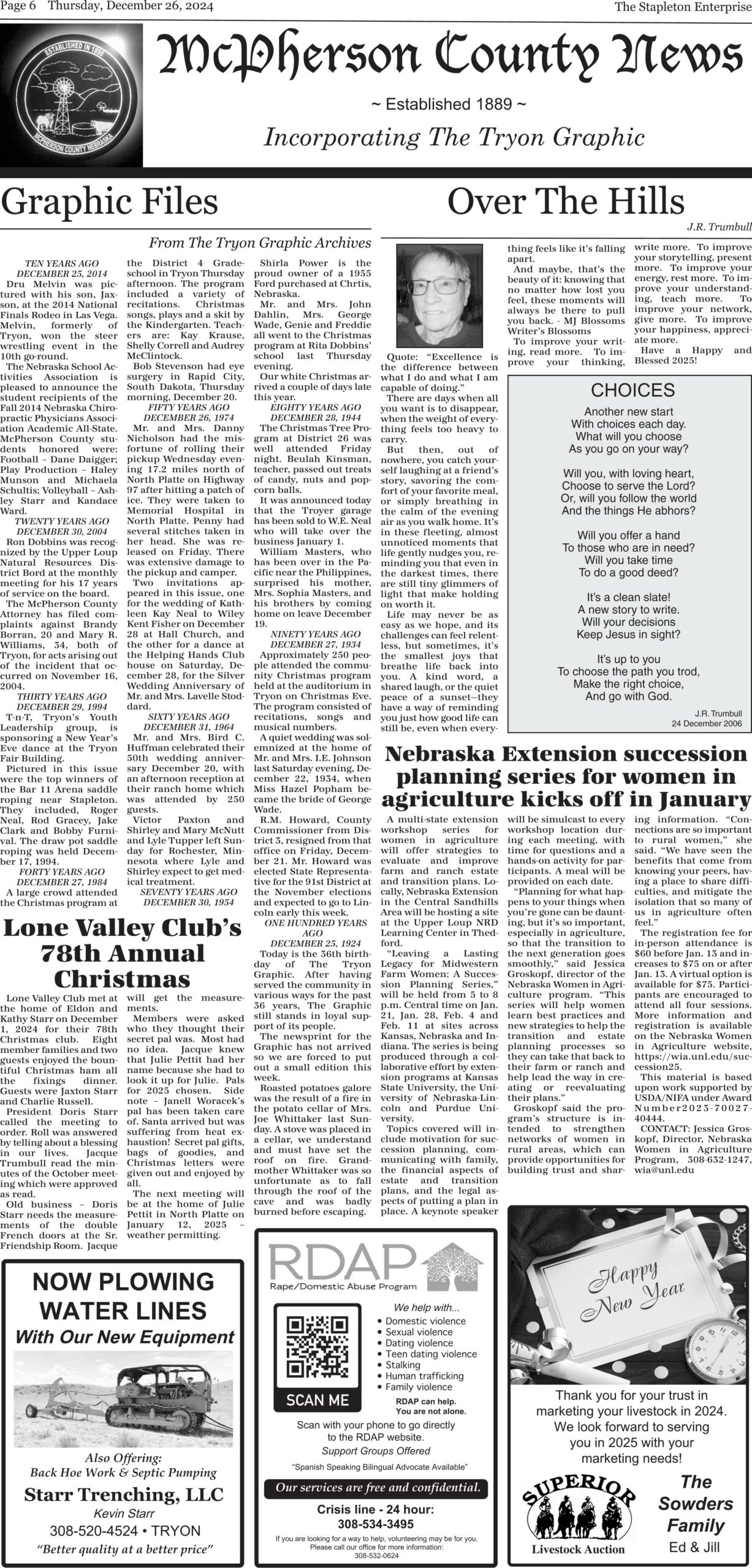 The McPherson County News was established in 1889. The Tryon Graphic and The Stapleton Enterprise merged into one newspaper in 2009. The McPherson County News continues to bring weekly news coverage of “the county.”