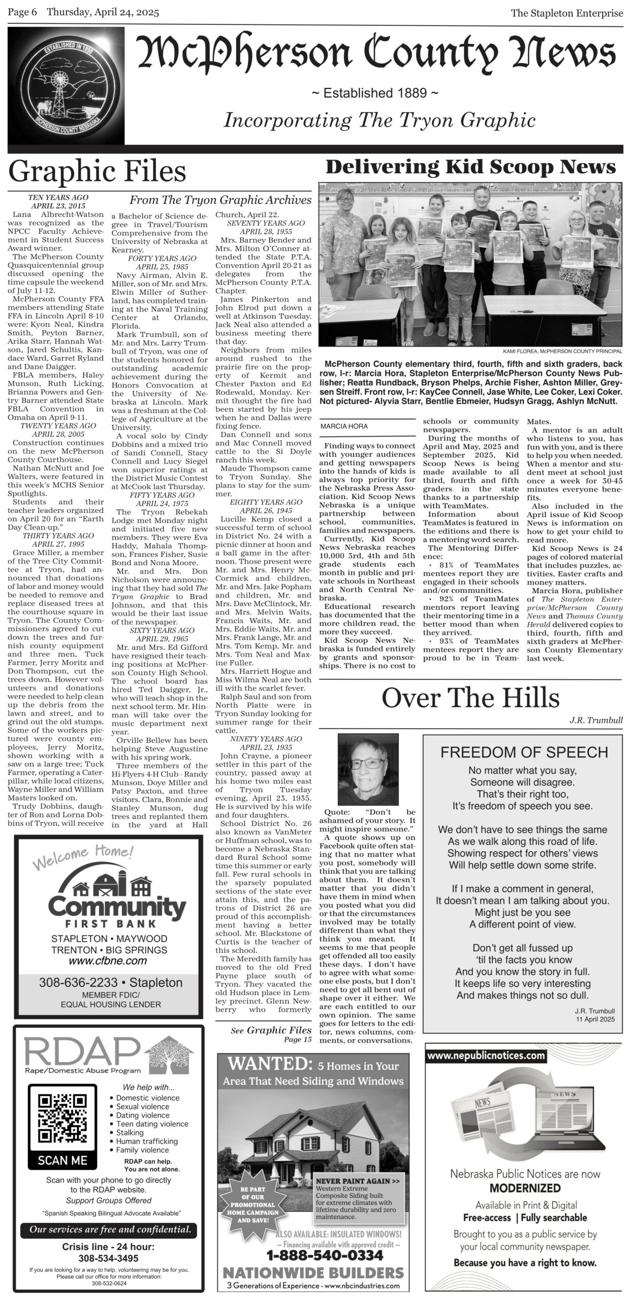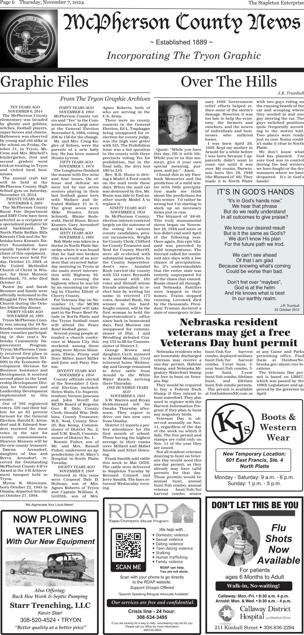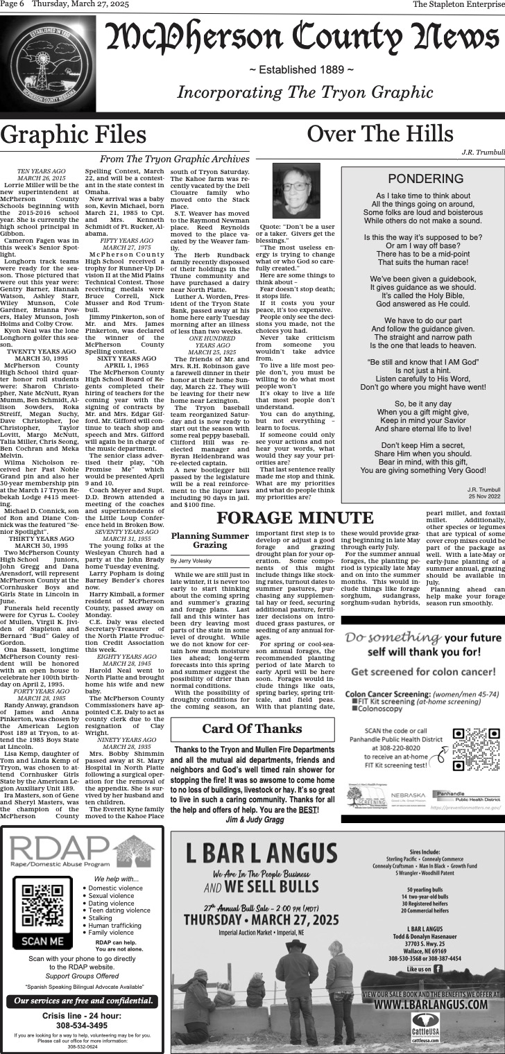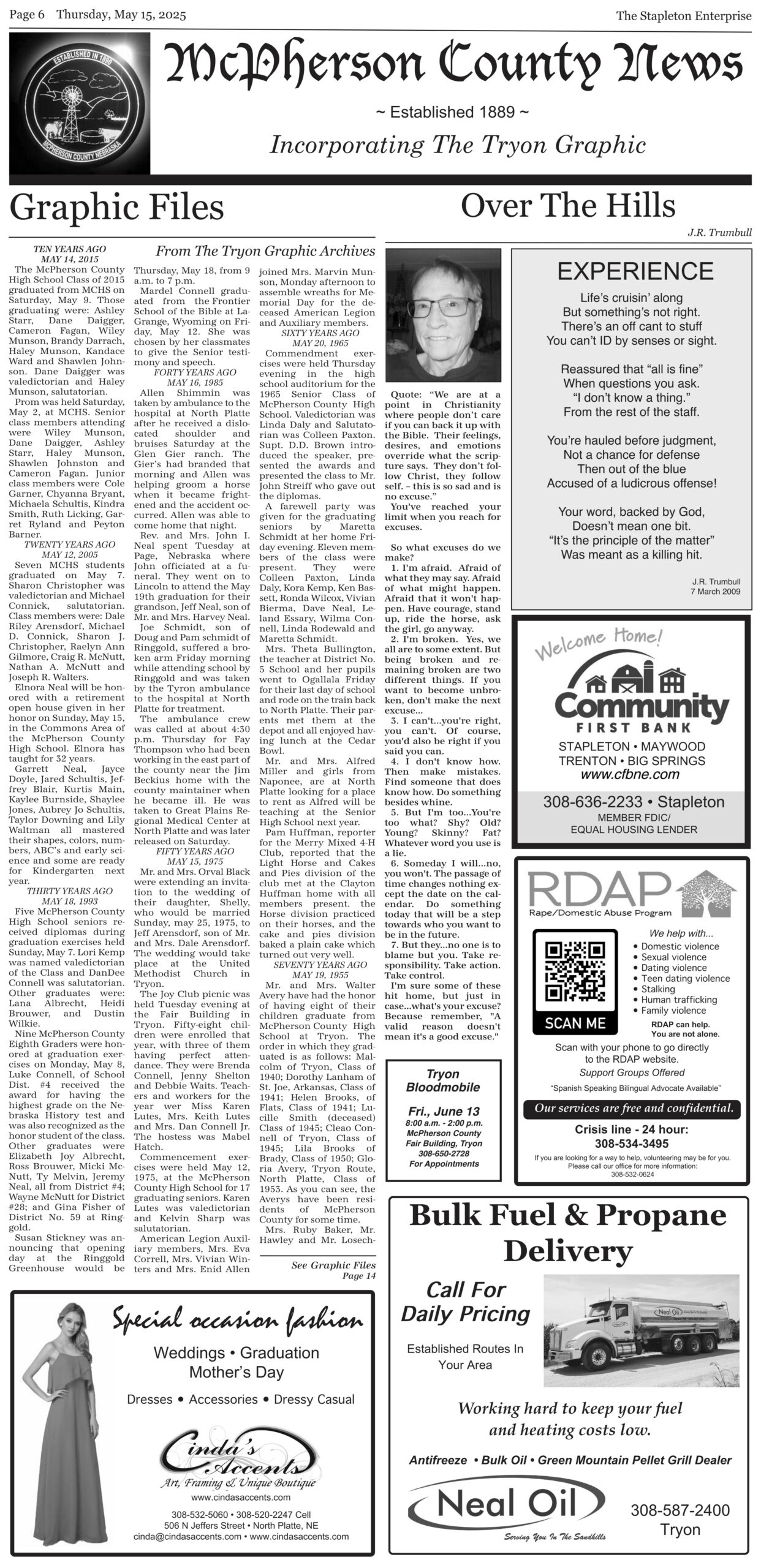 The McPherson County News was established in 1889. The Tryon Graphic and The Stapleton Enterprise merged into one newspaper in 2009. The McPherson County News continues to bring weekly news coverage of “the county.”