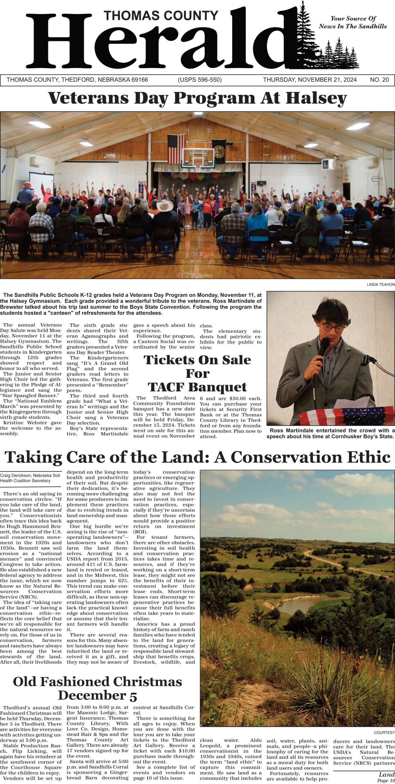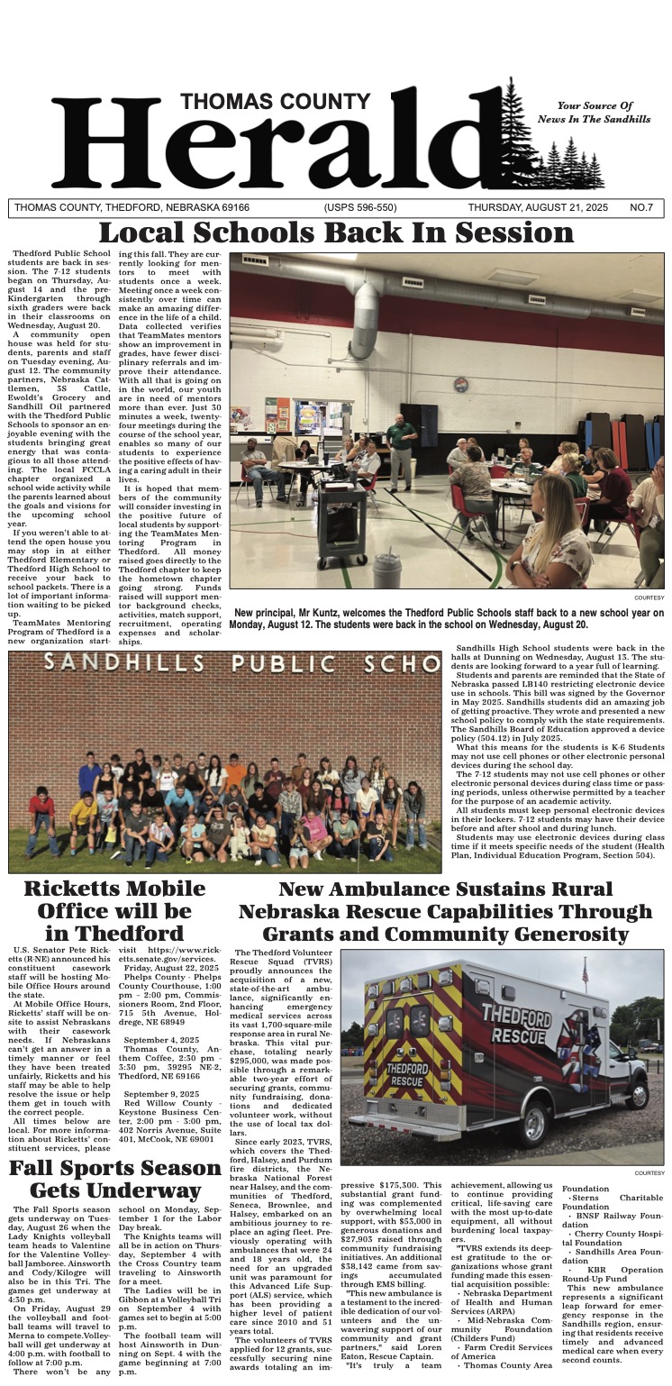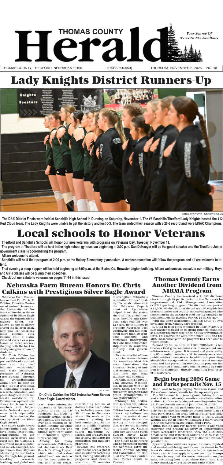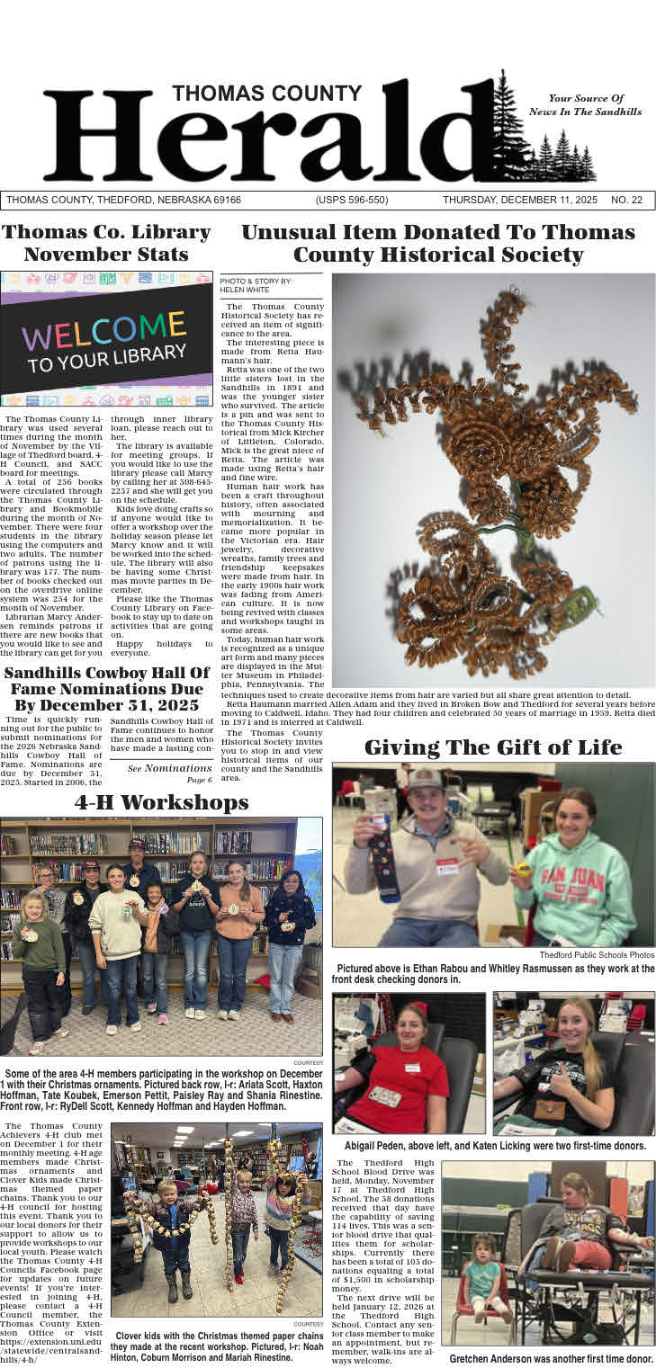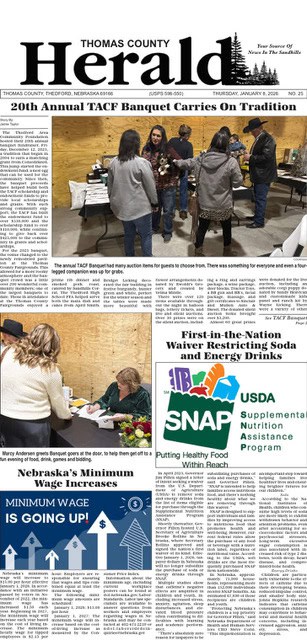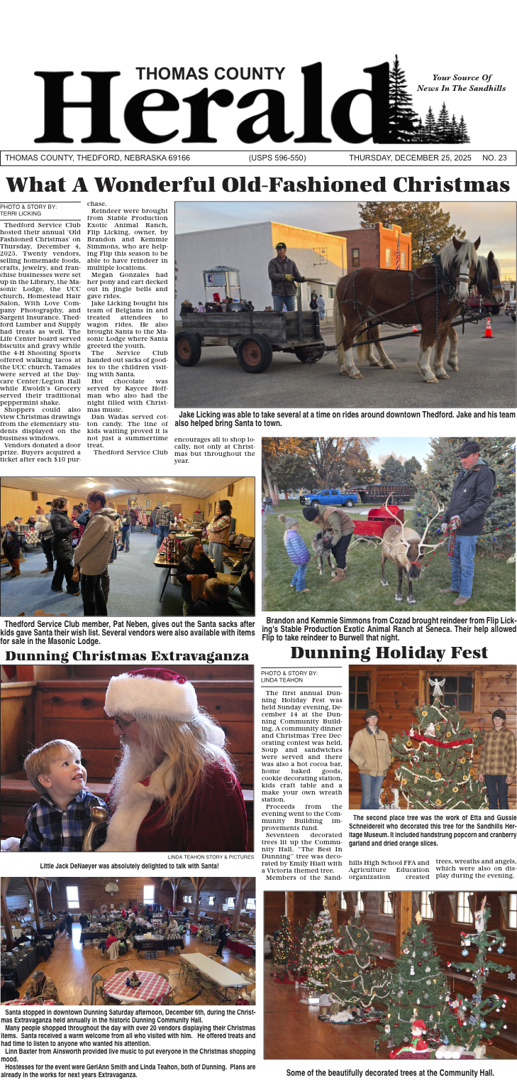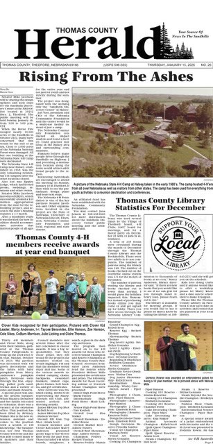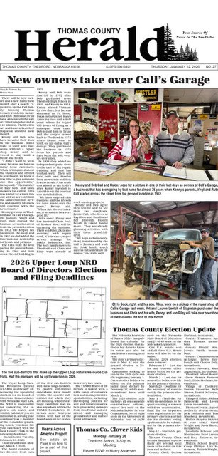 The Thomas County Herald is the official newspaper of Thomas County and serves the residents of Thedford, Halsey, Seneca and Dunning. The Thomas County Herald was re-established in 1981 after the Thomas County Herald-Clipper ceased publication in 1965.