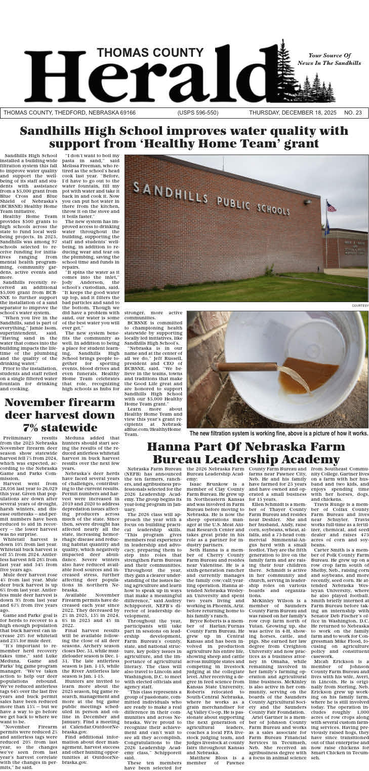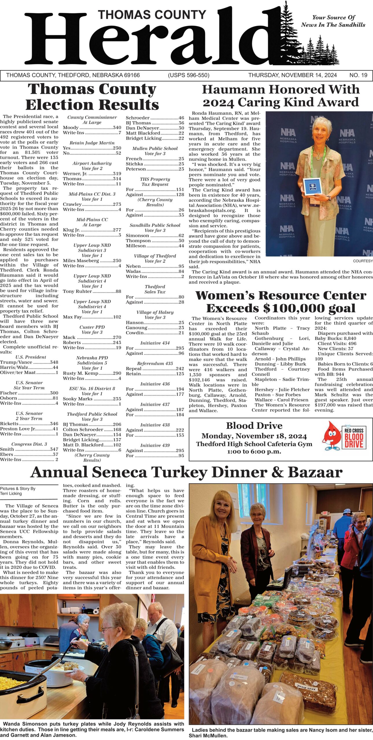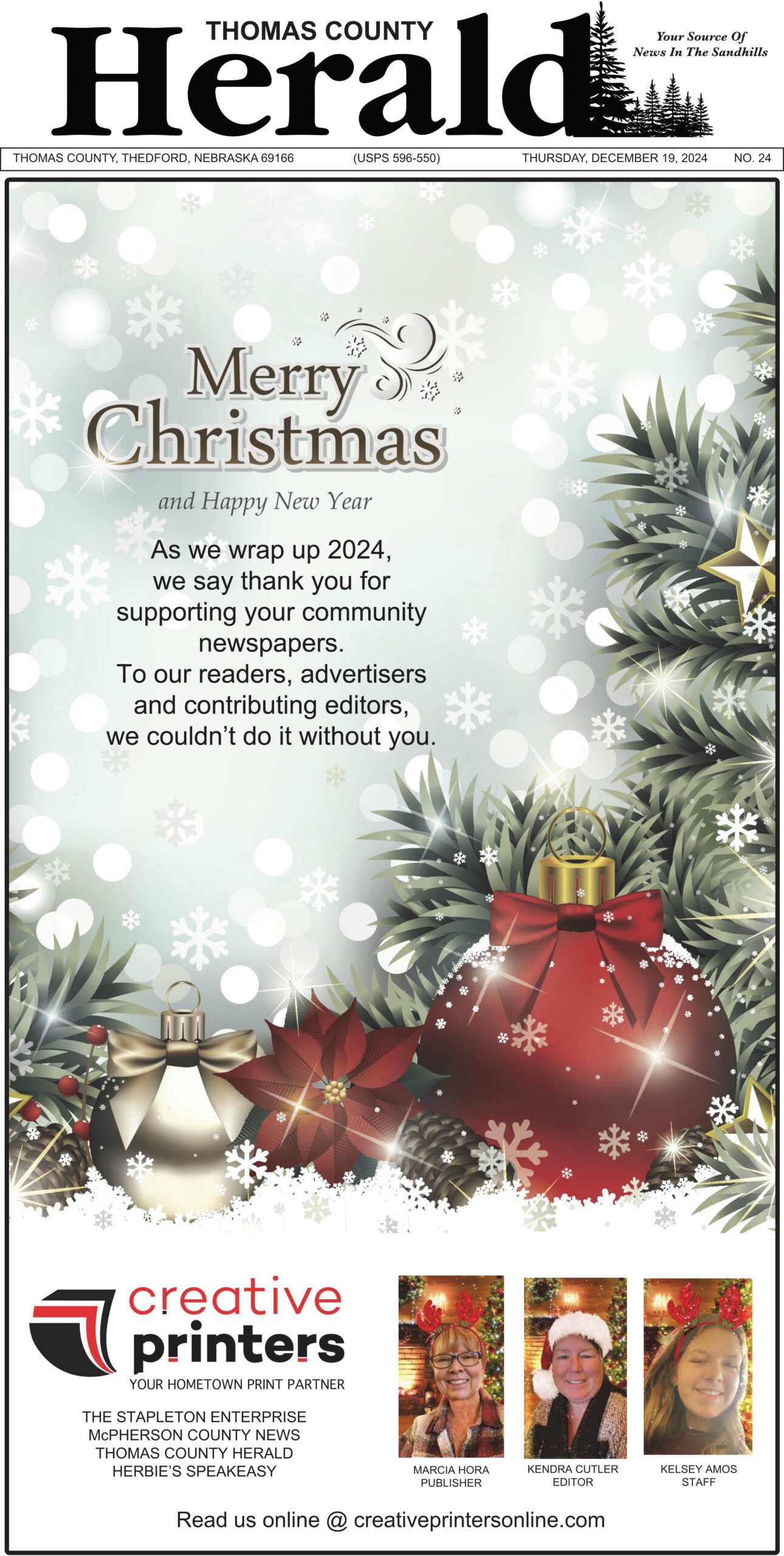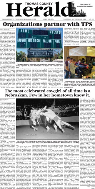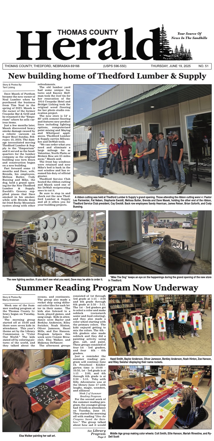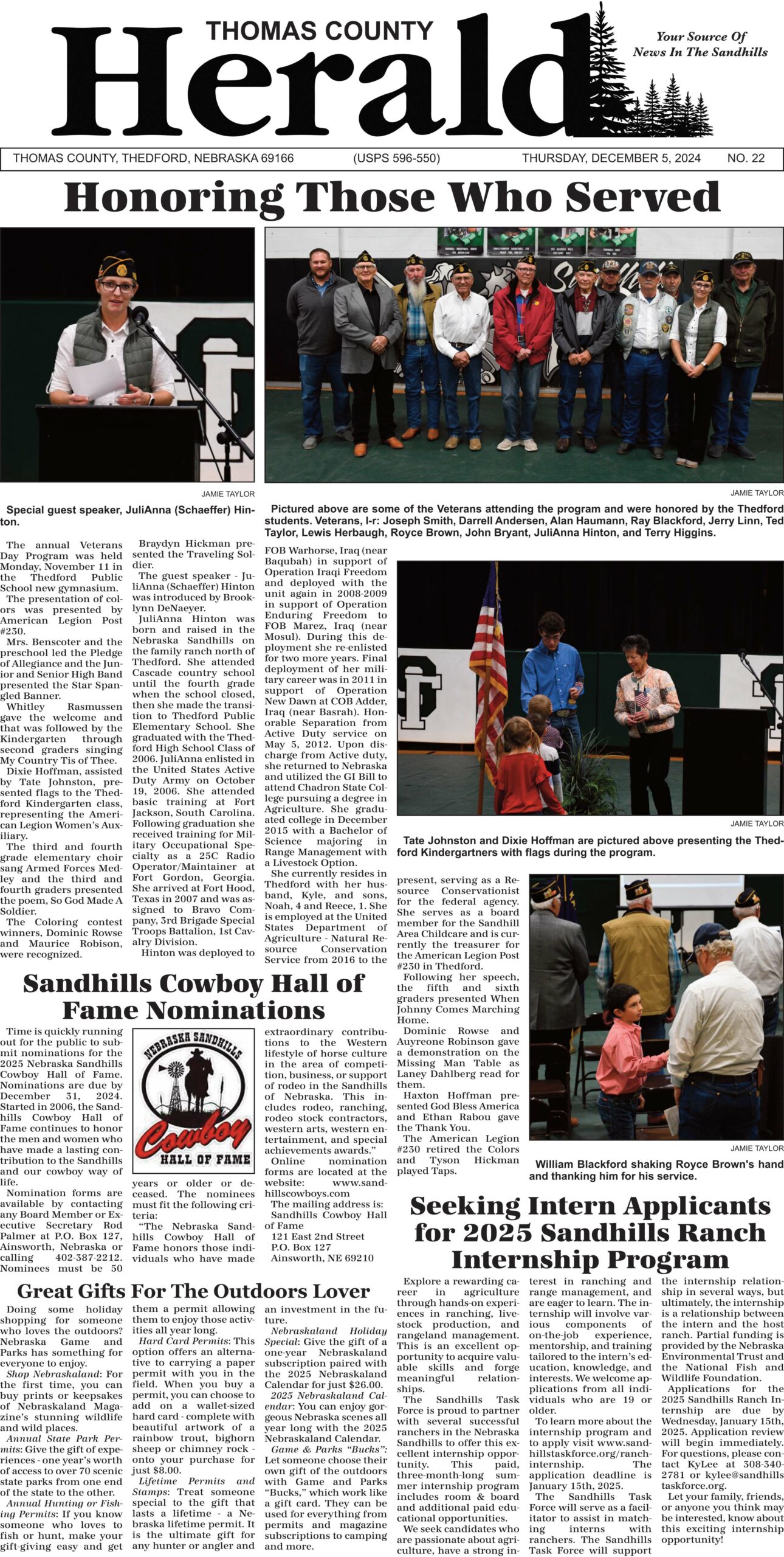 The Thomas County Herald is the official newspaper of Thomas County and serves the residents of Thedford, Halsey, Seneca and Dunning. The Thomas County Herald was re-established in 1981 after the Thomas County Herald-Clipper ceased publication in 1965.