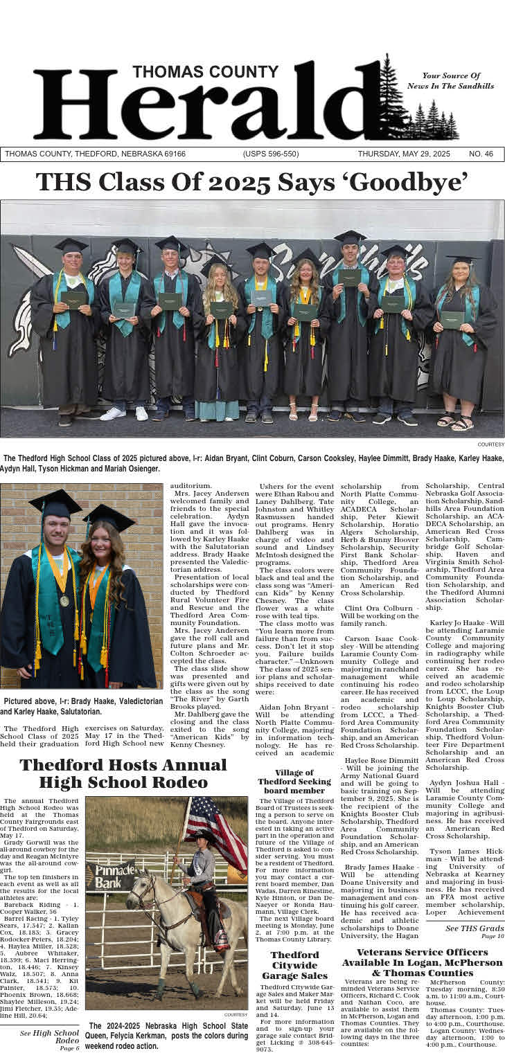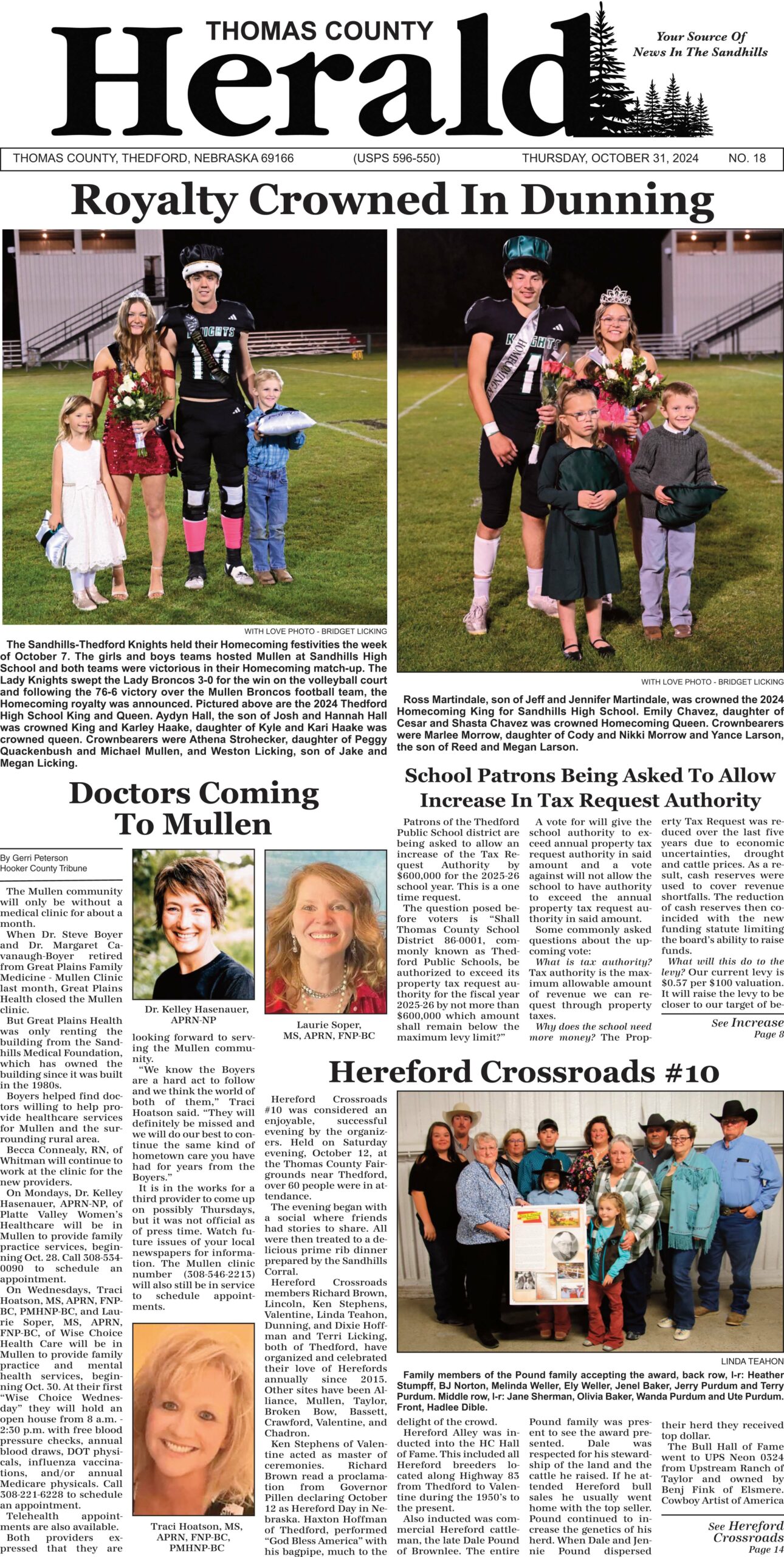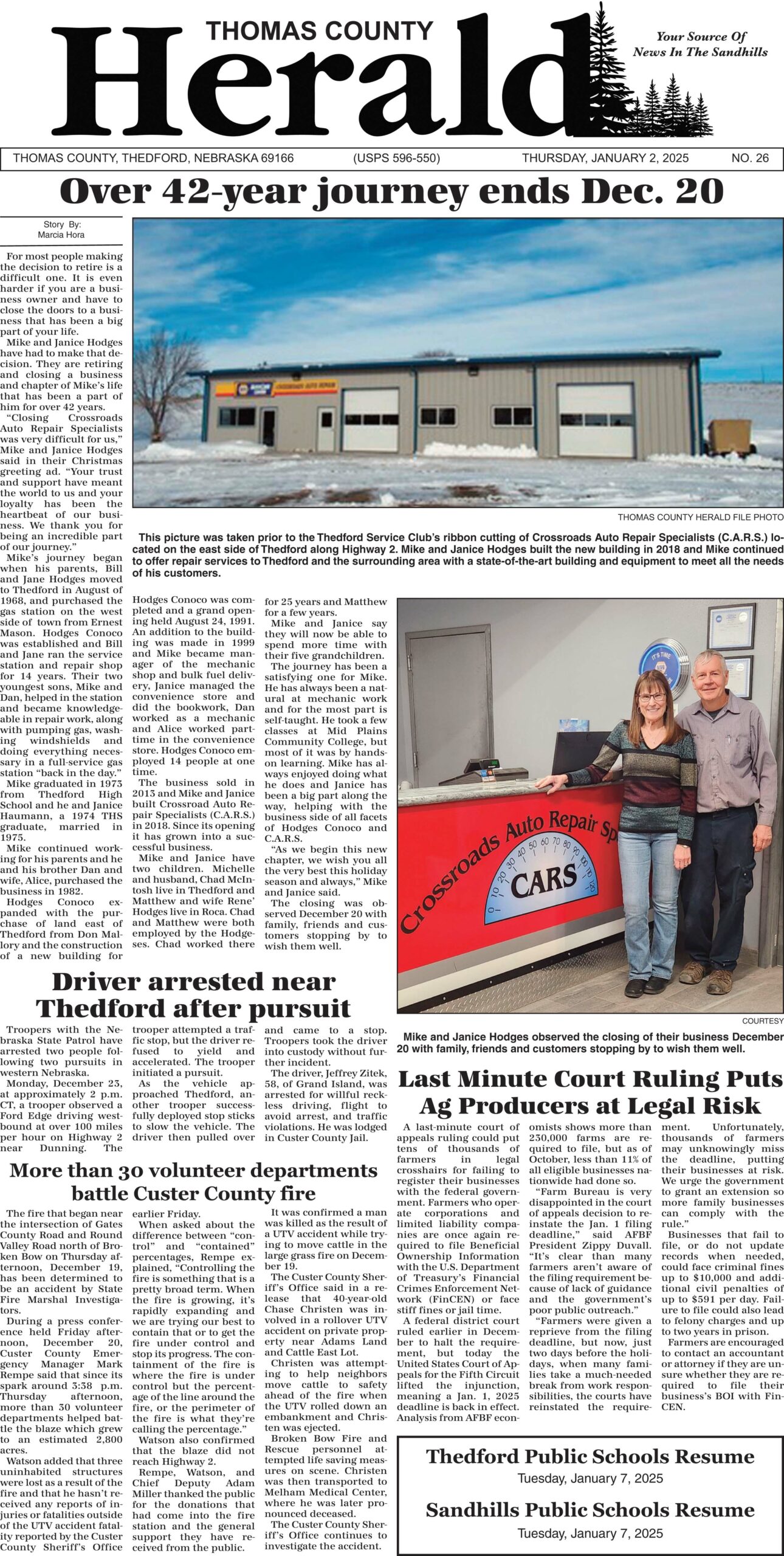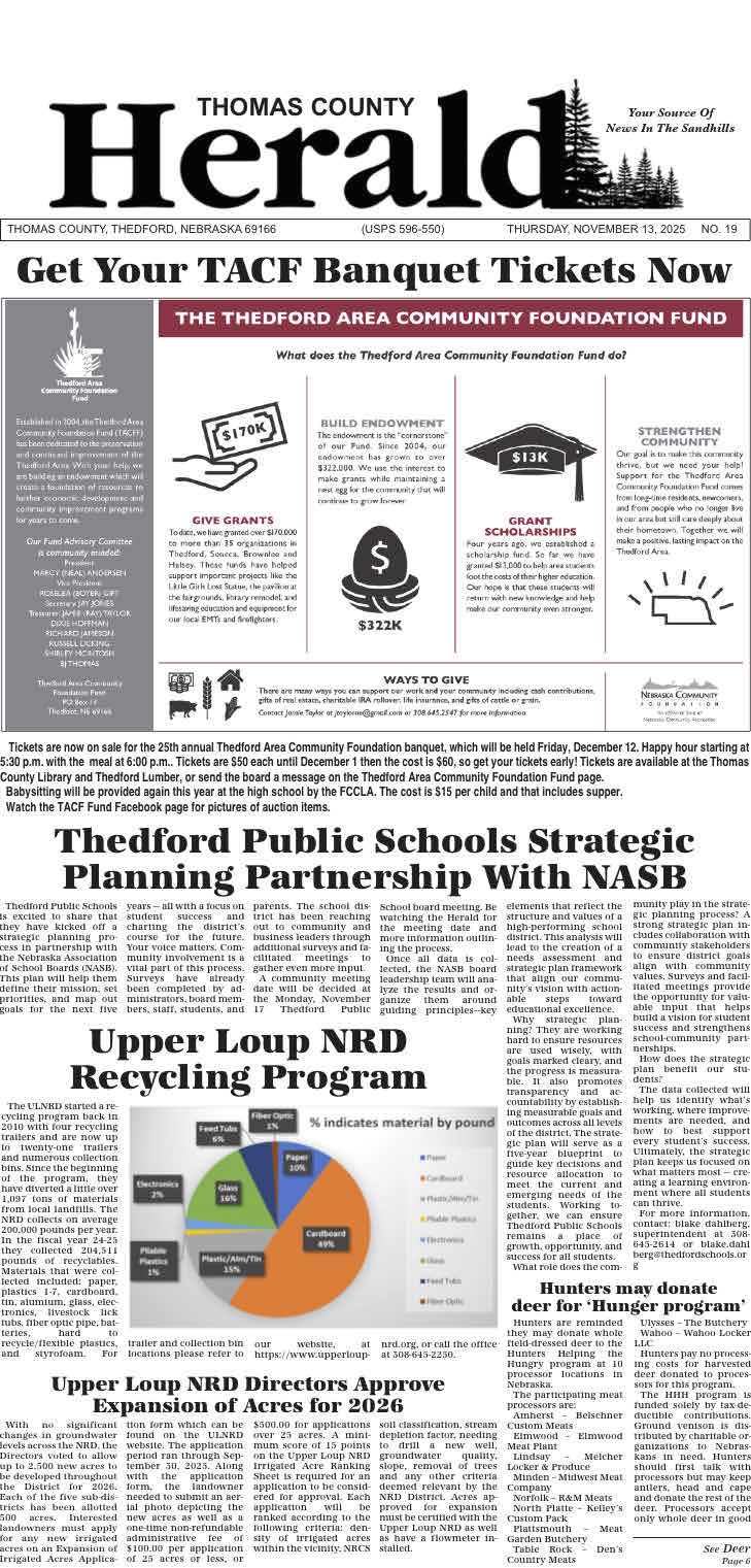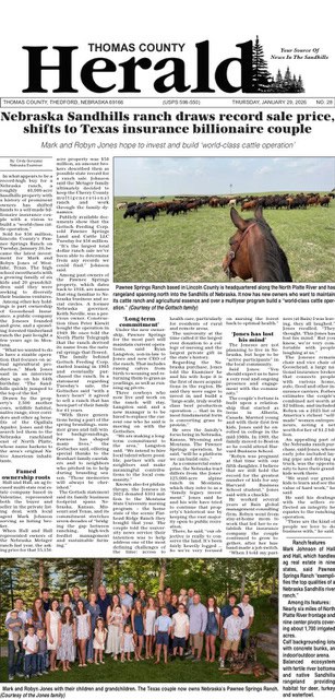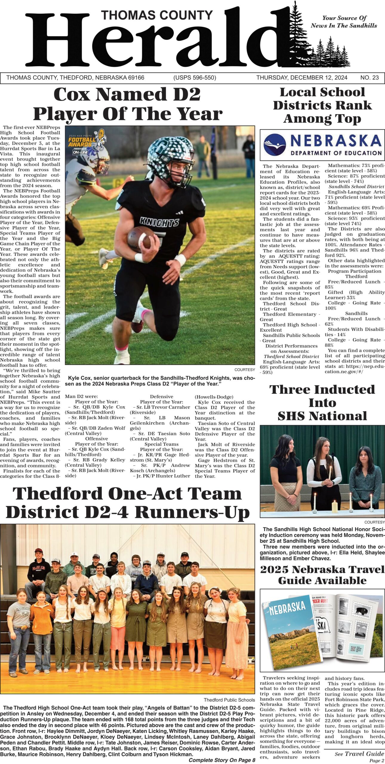 The Thomas County Herald is the official newspaper of Thomas County and serves the residents of Thedford, Halsey, Seneca and Dunning. The Thomas County Herald was re-established in 1981 after the Thomas County Herald-Clipper ceased publication in 1965.