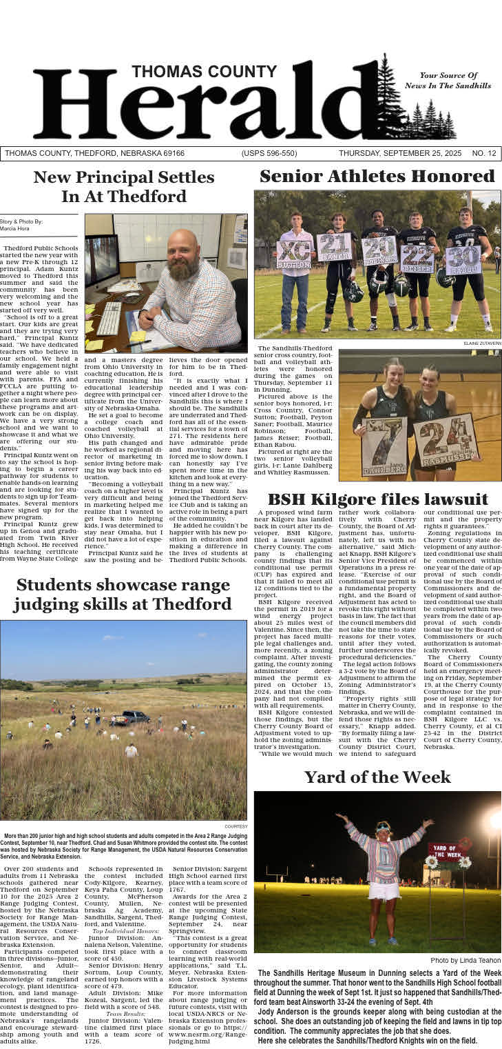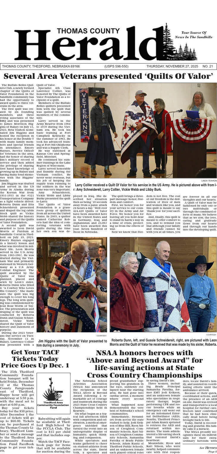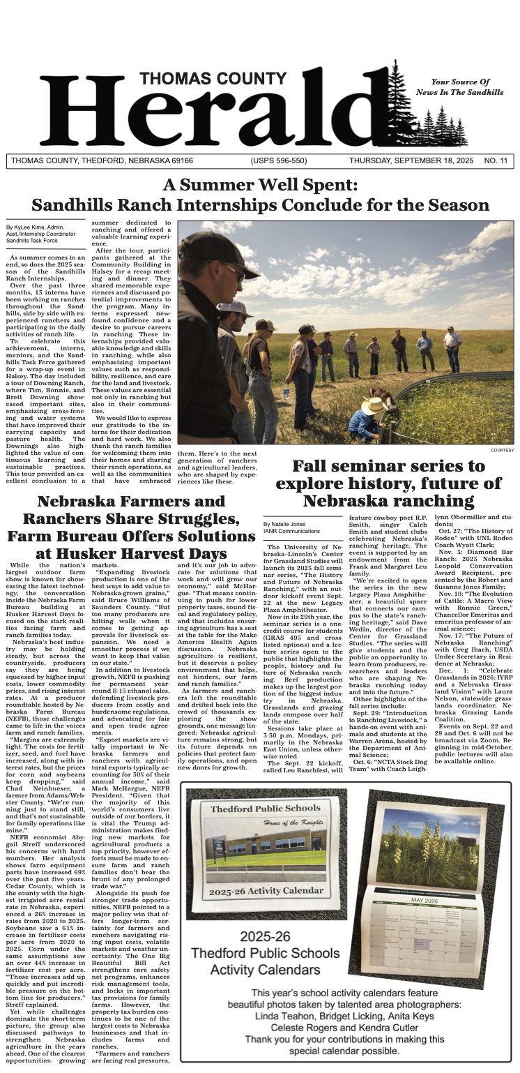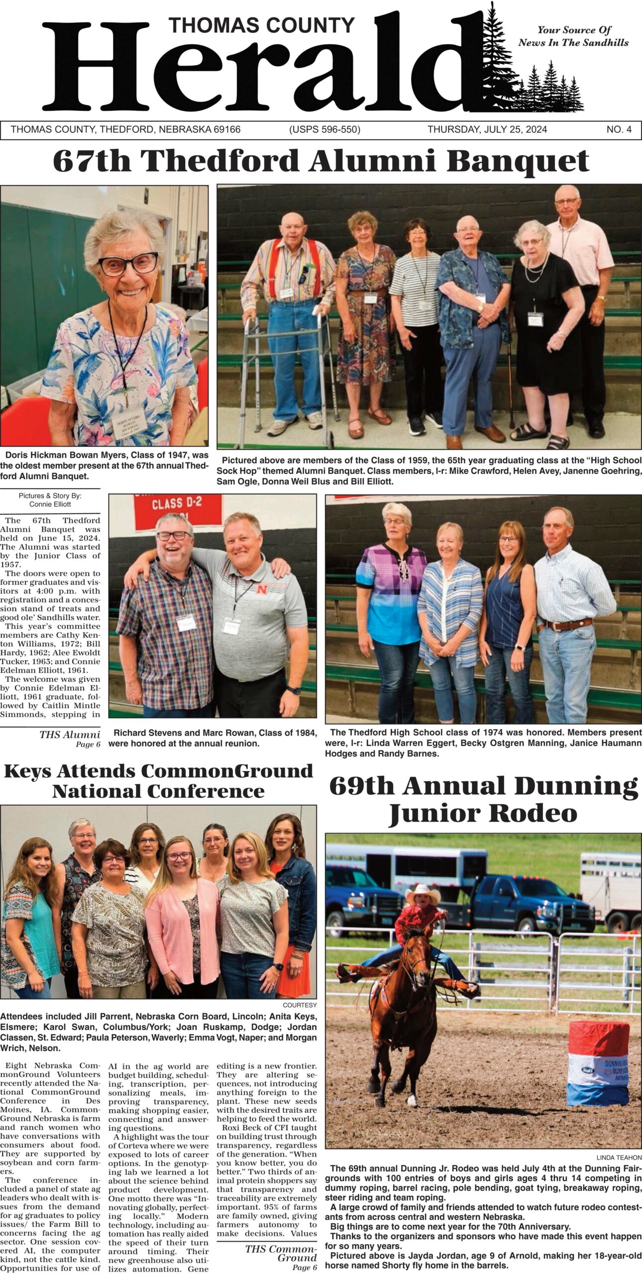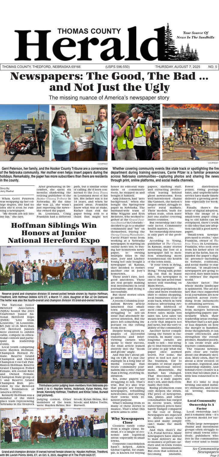 The Thomas County Herald is the official newspaper of Thomas County and serves the residents of Thedford, Halsey, Seneca and Dunning. The Thomas County Herald was re-established in 1981 after the Thomas County Herald-Clipper ceased publication in 1965.