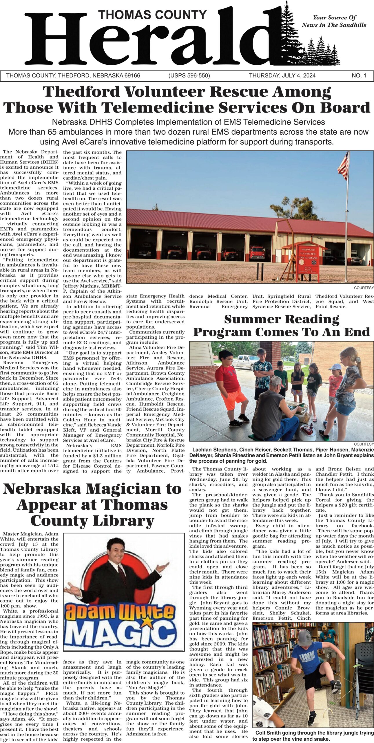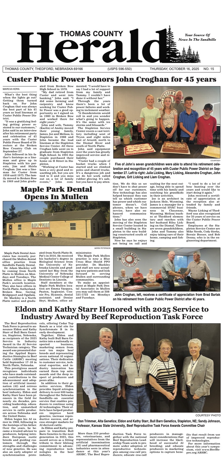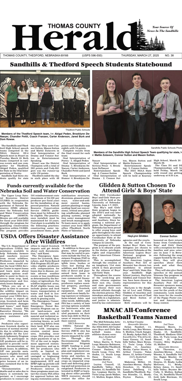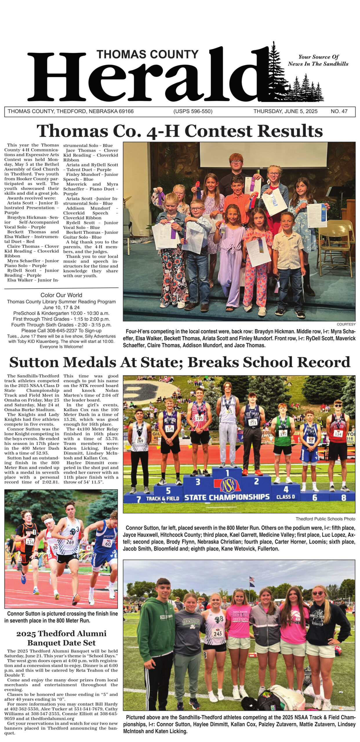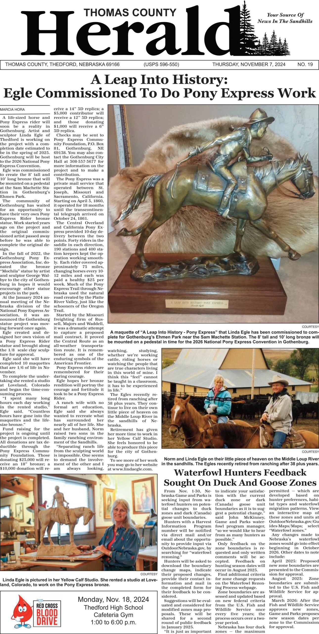 The Thomas County Herald is the official newspaper of Thomas County and serves the residents of Thedford, Halsey, Seneca and Dunning. The Thomas County Herald was re-established in 1981 after the Thomas County Herald-Clipper ceased publication in 1965.